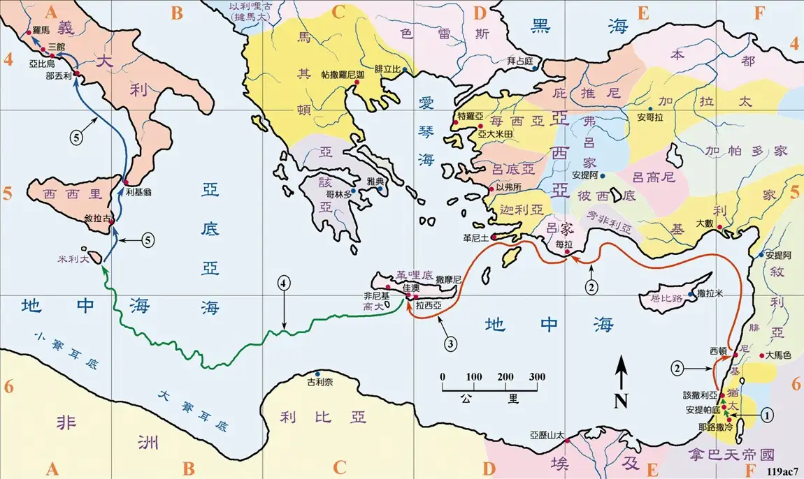 地點:西頓、貼賽普勒斯、基利家、旁非利亞、呂家之每拉革尼土克裡特島、撒摩尼佳澳、高大島